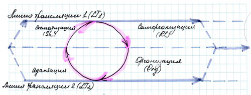 Давайте представим, что верхняя, равно как и нижняя, линии - это такие нити трансляции. Жизненные пути или то, где мы воспроизводимся или воссоздаемся, или где происходит наша вовлеченность в определенный образ жизни, или когда-то происходят остановки, в которых происходит наше воззрение на мир, на самих себя. Засыпая, мы редко сомневаемся в том, что мы проснемся теми же самыми, и утром, когда просыпаемся, у нас не возникает вопрос, а кем я был вчера вечером, если это не экстренные какие-то обстоятельства и не возникает таких сомнений, что же собственно произошло. Во всяком случае, идентичность личностная в ежедневном ритме - это неоговариваямая предпосылка. Ну и другая линия, которая нам понадобится чуть позже. Ну, вот тут я воссоздаюсь, здесь есть задача реализовать себя в чем-то. Но это очень важно, если мы имеем дело с некими векторными сущностями, тут предполагается движение, перенос, перемещение в какое-то другое состояние и тут очень важно различать направленность самой стрелки и ее соотнесение чему-то. Если я направлен на счастье самореализации, но у меня пока нет его, это не означает, что я к нему могу как-то относиться. Его может и не быть в памяти. Вот направленность и соотнесенность. Чистое стремление, интенция (направленность по латыни), и соотнесенность – это просто надо сначала себе представить. Вот если по отношению к первой линии трансляции дуга именуется самореализацией, то в процессе этой самой реализации мы в другом месте что-то организуем. В этом смысле процесс самореализации это не то, что цветение весной пышного куста сирени. Вот оно все расцвело, и я тут благоухаю этой реализованностью. Это случается только тогда, когда что-то ... какие-то инструменты, вещи, знаки, состояния душевные (не важно, что, важна разница отношений). Когда мы говорим «самореализация», то в другой нити предполагается организация. И вот тут даже заметно предположение о нашей множественности. То есть в одном случае я обеспокоен своей самореализацией и в другой части я должен что-то организовать. Вот самый банальный пример, ну например, временное расписание, жить в определенном режиме, определенный режим питания и т.д. Важно, что это одно существует само по себе, и мы реализуя, организуем. Но это по направленности от одной к другой. То есть если мы говорим «я самореализуюсь», значит, я что-то организую. Но возможно имеет место и обратная направленность, и тогда то, что происходит в линии 2, мы к нему адаптируемся, приспосабливаемся. Если вы уберете ассоциации с конформизмом, перестанете видеть отказ от себя, то это не так. Вы должны, имея целью самореализацию, что-то организуя, вы должны так это сделать, чтобы это была твоя, то есть ты это адаптируешь к себе, а смысл самого отношения сохраняется. Тут положено улыбаться.