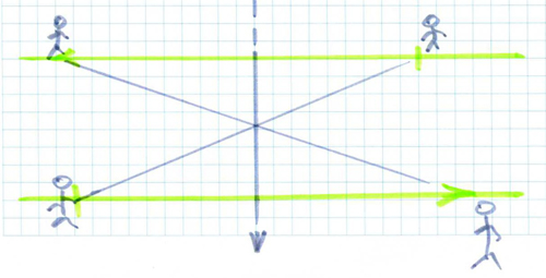 И что есть другой, который начинает свое движение от будущего и движется в этом направлении. И вот допустим, что в некотором, пока не оговоренном смысле, они видят и как-то воспринимают друг друга. И вот получается такая странная вещь. Они движутся, один в одном направлении, другой – в другом и они начинают с очень далекого расстояния. И двигаясь навстречу друг другу, они становятся еще дальше. Тут очень важно различие двух точек зрения. Продольная. Мы такие существа, которые все время движемся вперед. Был один чудак, который обошел земной шар спиной назад. НО шел-то он все равно вперед. У него на стенке очков была зеркальная поверхность, но шел-то он все равно вперед! Неудобно, конечно. Это продольно. А есть кто-то, кто смотрит поперечно. Вот эти два вида взгляда радикально противоположны друг другу. Вот вы ощущаете, что тут телесно, наглядно ощутимое поведение. Можно и так и так смотреть. Оно одновременно схематизировано по жизни. «Посмотрел на меня косым взглядом». Проходил мимо и скосил глаза. А сам идет туда. Или он в глаза, как Феликс Эдмундович Дзержинский - знаменитый взгляд. Георгий Петрович Щедровицкий тренировал некоторых учеников на этот взгляд у зеркала. Чтобы такими буравчиками всю душу выворачивали. Вот они смотрят друг на друга поперечным взглядом, и есть такое место, когда расстояние между ними минимально. А вначале оно было гораздо больше и в конце оно будет гораздо больше. Тут еще вступает в силу отношение зеркальности и симметрии между одним и другим существом. Вот такая, как не странно, точно построенная по восприятию времени, экзотическая, а теперь общепринятая модель элементарных частиц. Фельдман Ричард, который движение электрона описал именно своей диаграммой именно в двух разных временах. И подтверждается экспериментально, что электрон, движущийся вперед, ему соответствует позитрон в строго обратном направлении. Такая частица. Но в зависимости от того направления, в котором она движется, она ведет себя иначе, и еще когда они встречаются, там происходит высвобождение энергии. То есть я просто хочу сказать, что вот этот способ такого бифокального (с двух концов смотрящий взгляд). Это очень просто, если допустить прямую и обратную перспективу времени.